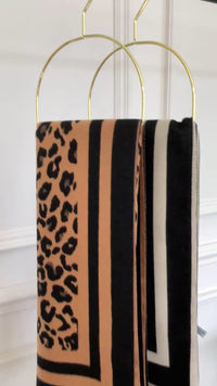 - Womens brown reversible blanket scarf shawl wrap in a leopard print design with a stripe border.