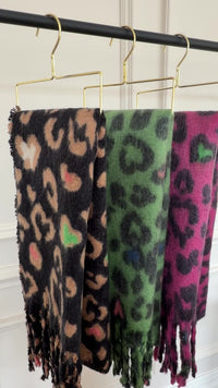 Wrap yourself in warmth and style with this oversized blanket scarf, featuring a striking leopard print design adorned with colourful hearts. Crafted from 100% polyester, this generously sized shawl measures 195cm x 40cm, offering versatile styling options - wear it as a cosy wrap, infinity scarf, or wearable blanket. The soft, delicate fabric feels luxurious against the skin whilst remaining lightweight and easy to wear. Long tassel ends add a finishing touch to this multi-purpose accessory, perfect for layering during colder months. Machine washable at 30 degrees for easy care.