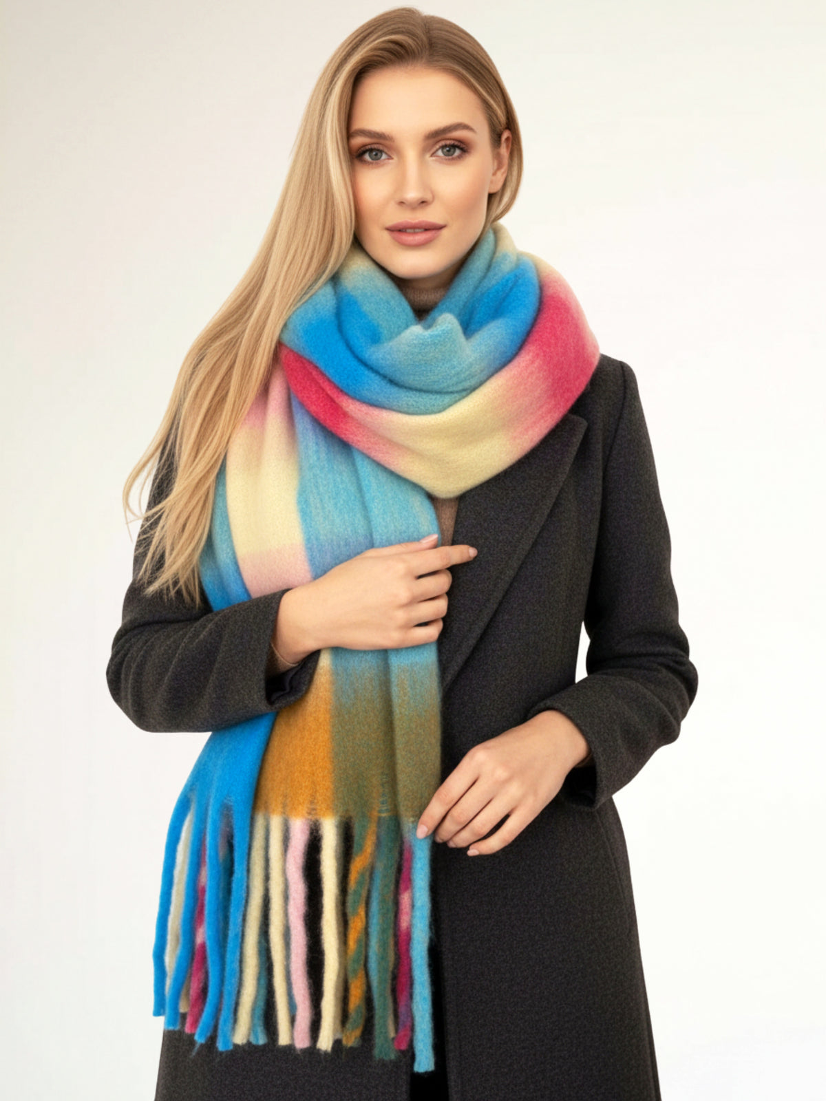 BLUE YELLOW CHECKED WOOL RAINBOW BLANKET SCARF OVERSIZED WINTER SHAWL WRAP
