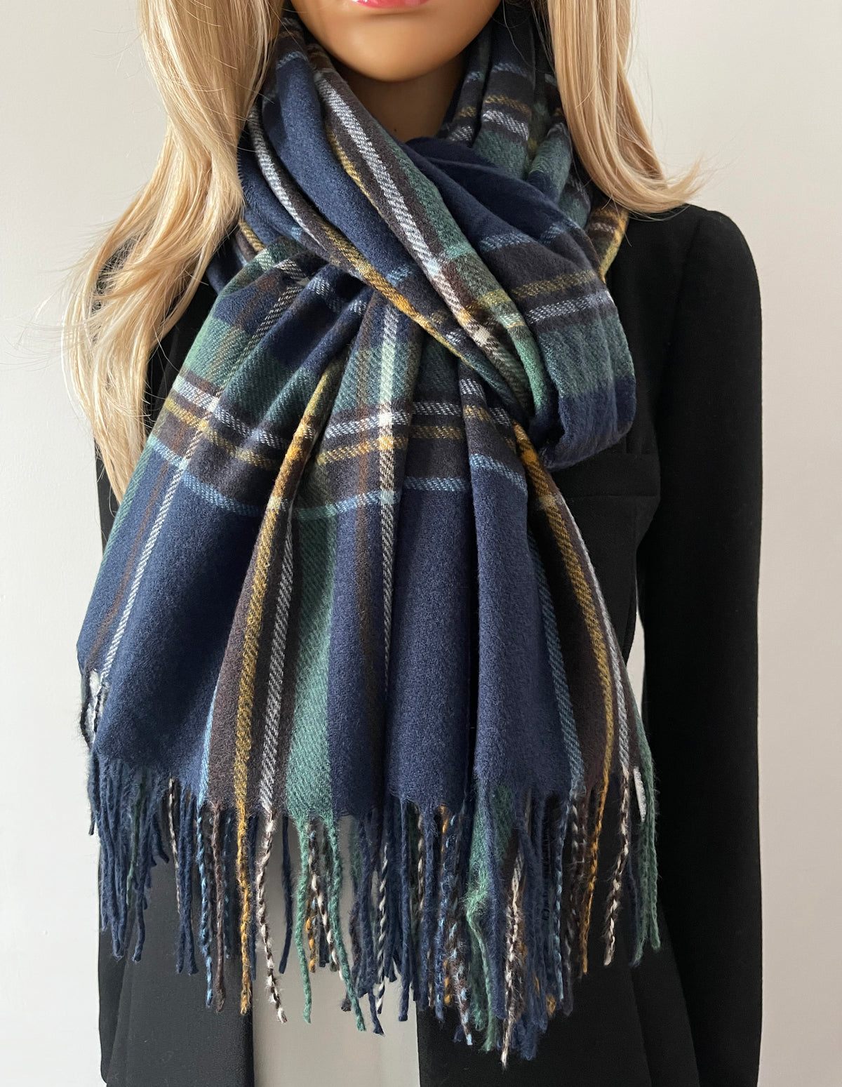 LONG NAVY BLUE WOOL MIX CHECKED TARTAN SCARF