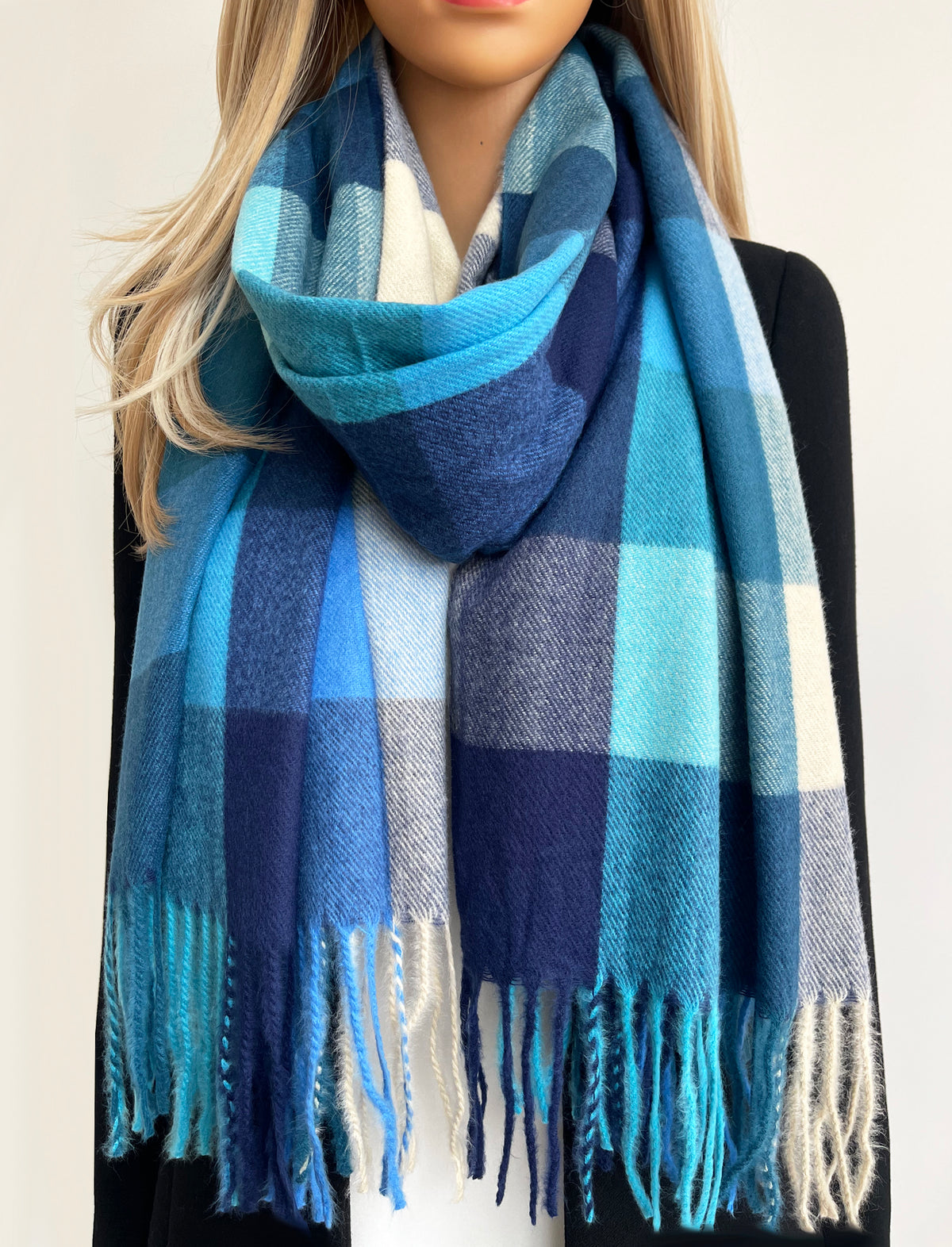 LONG BLUE WOOL MIX CHECKED TARTAN SCARF