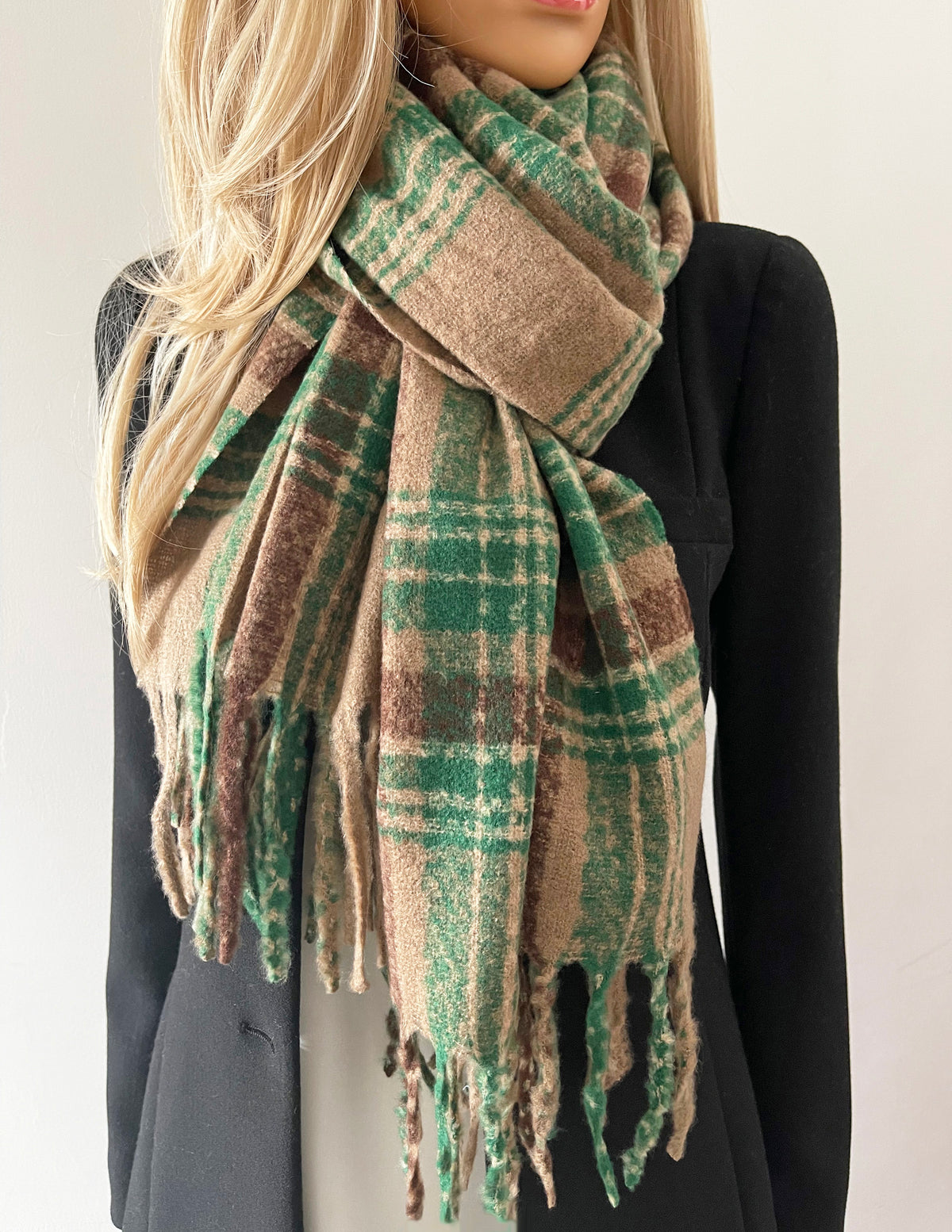 CHUNKY GREEN TARTAN HERRINGBONE STITCHED EDGE SCARF