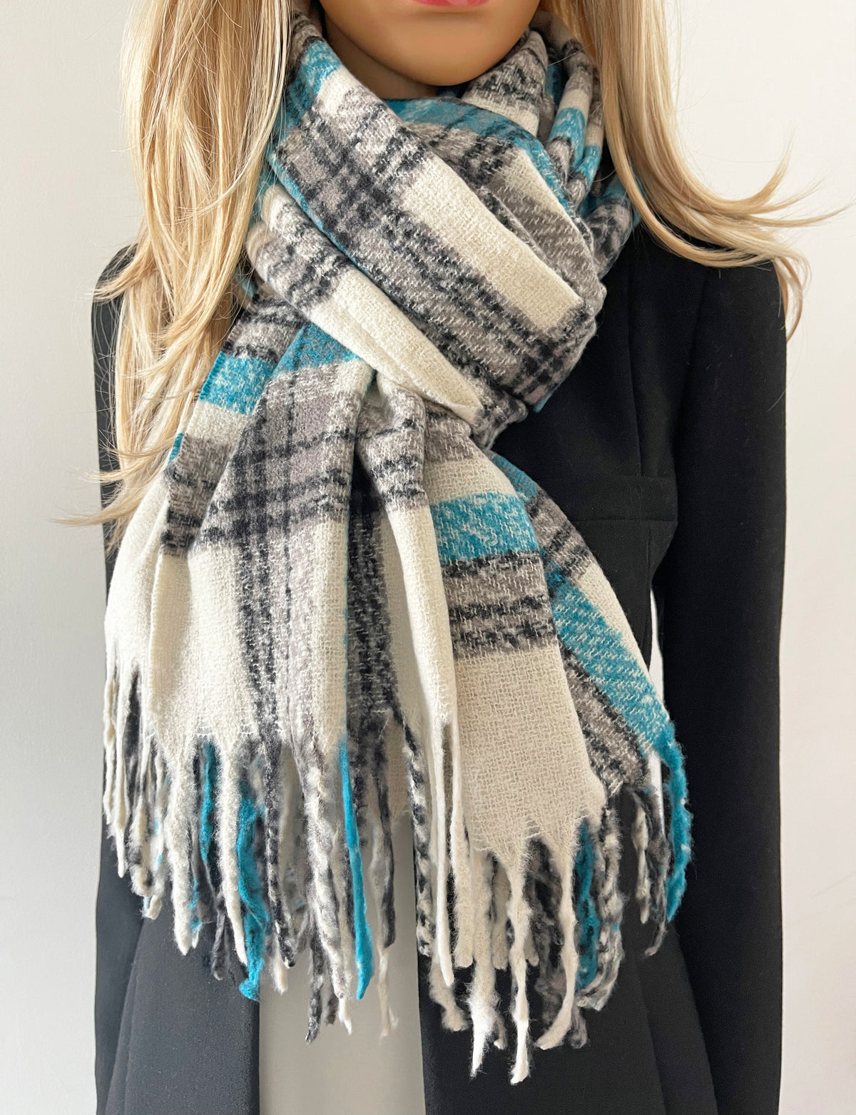 CHUNKY TEAL TARTAN HERRINGBONE STITCHED EDGE SCARF