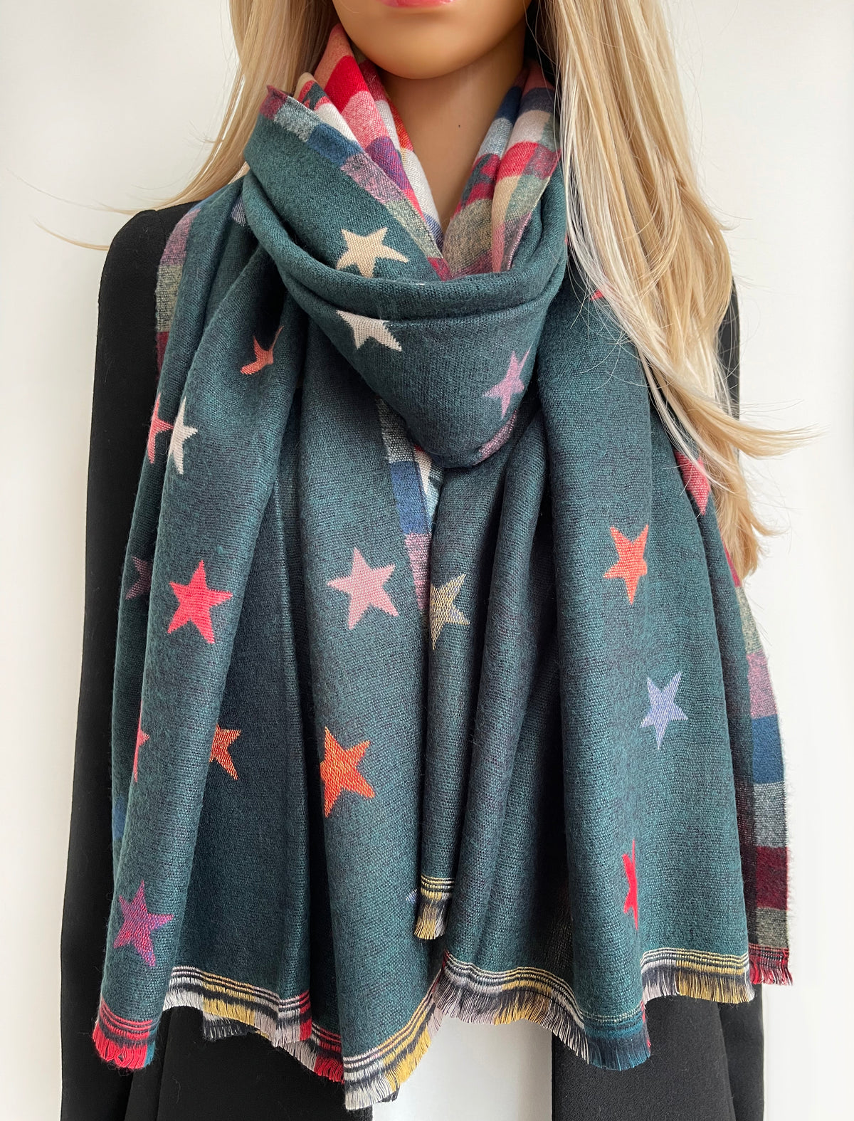 LARGE GREEN STAR PRINT REVERSIBLE CHECKED WINTER SHAWL BLANKET SCARF