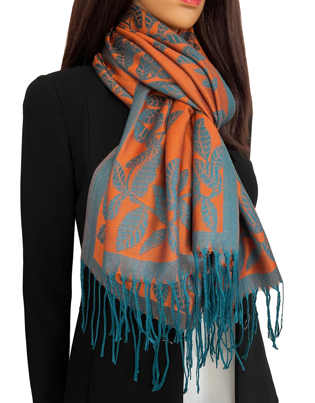 LARGE ORANGE TEAL LEAF PRINT REVERSIBLE PASHMINA SHAWL SCARF