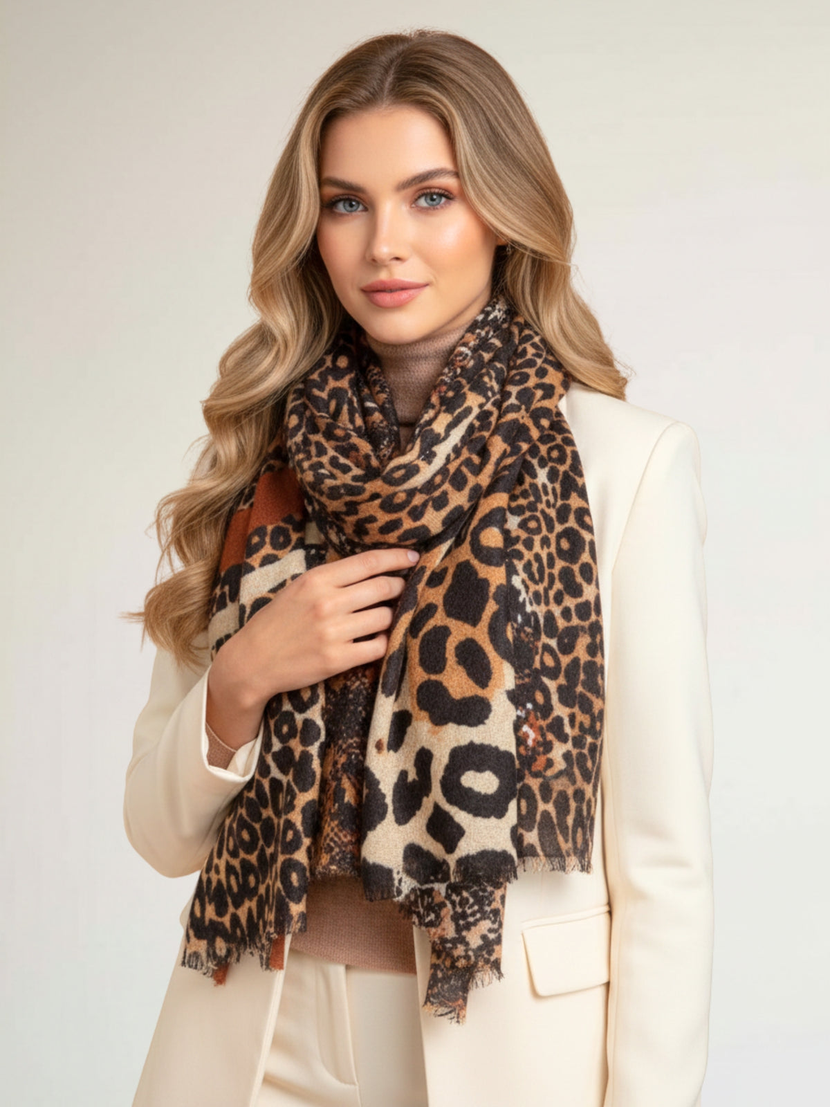 LONG BEIGE WOOL MIX FLUFFY OVERSIZED LEOPARD PRINT SCARF