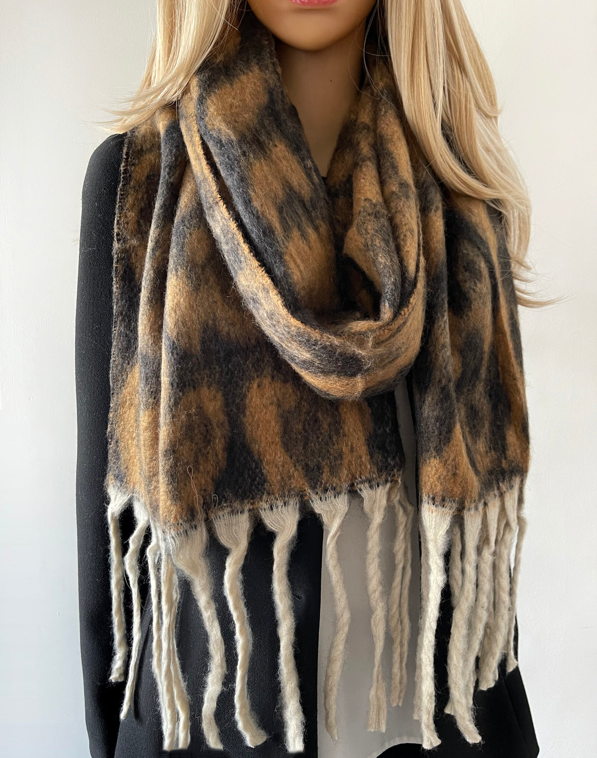 LONG BROWN WOOL MIX FLUFFY OVERSIZED LEOPARD PRINT SCARF