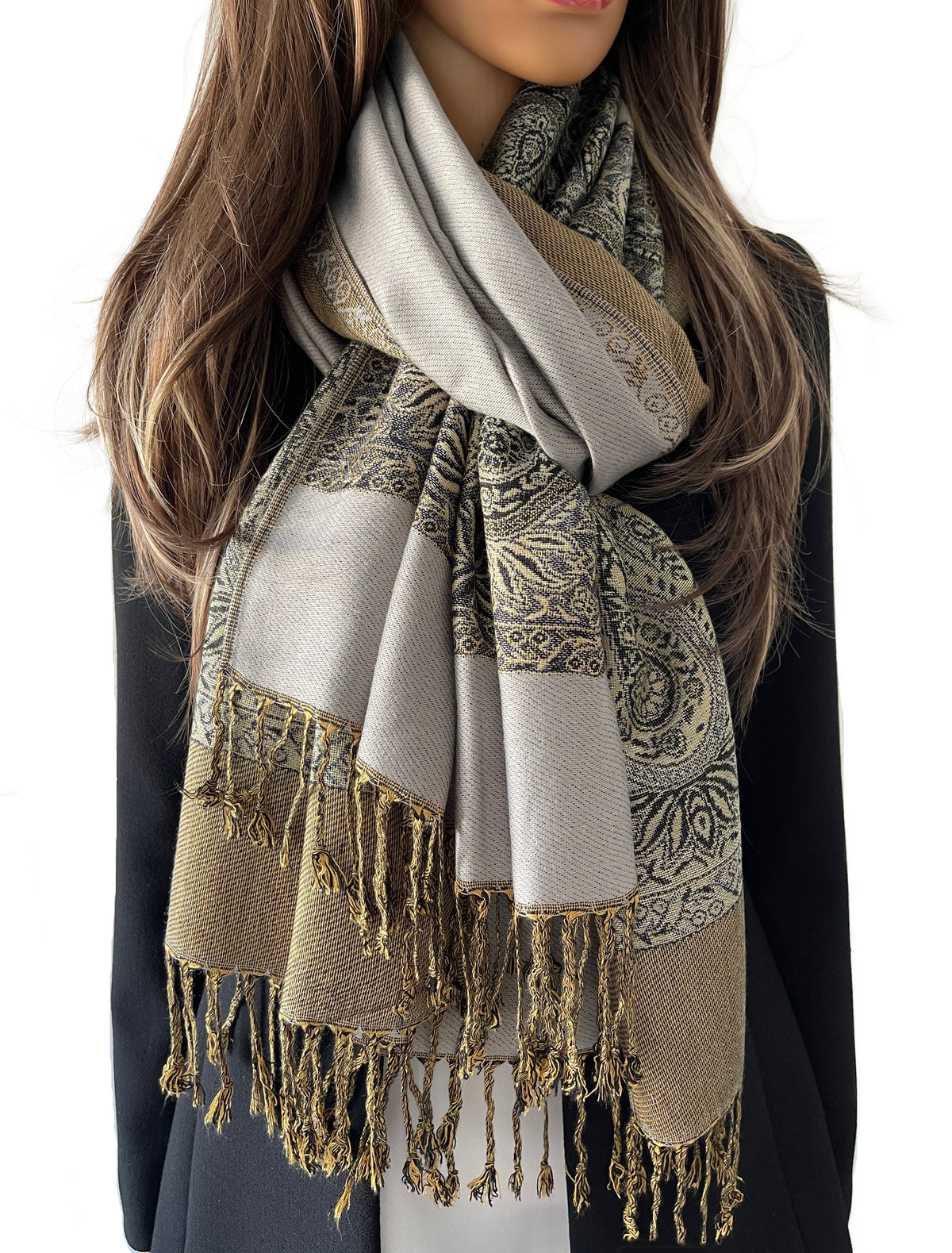 LARGE REVERSIBLE PAISLEY PRINT PASHMINA SHAWL SCARF WRAP - SILVER