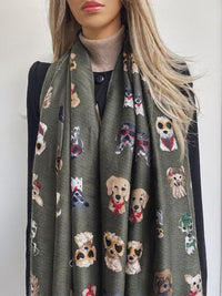 - Womens green large and long cotton mix dog print scarf.