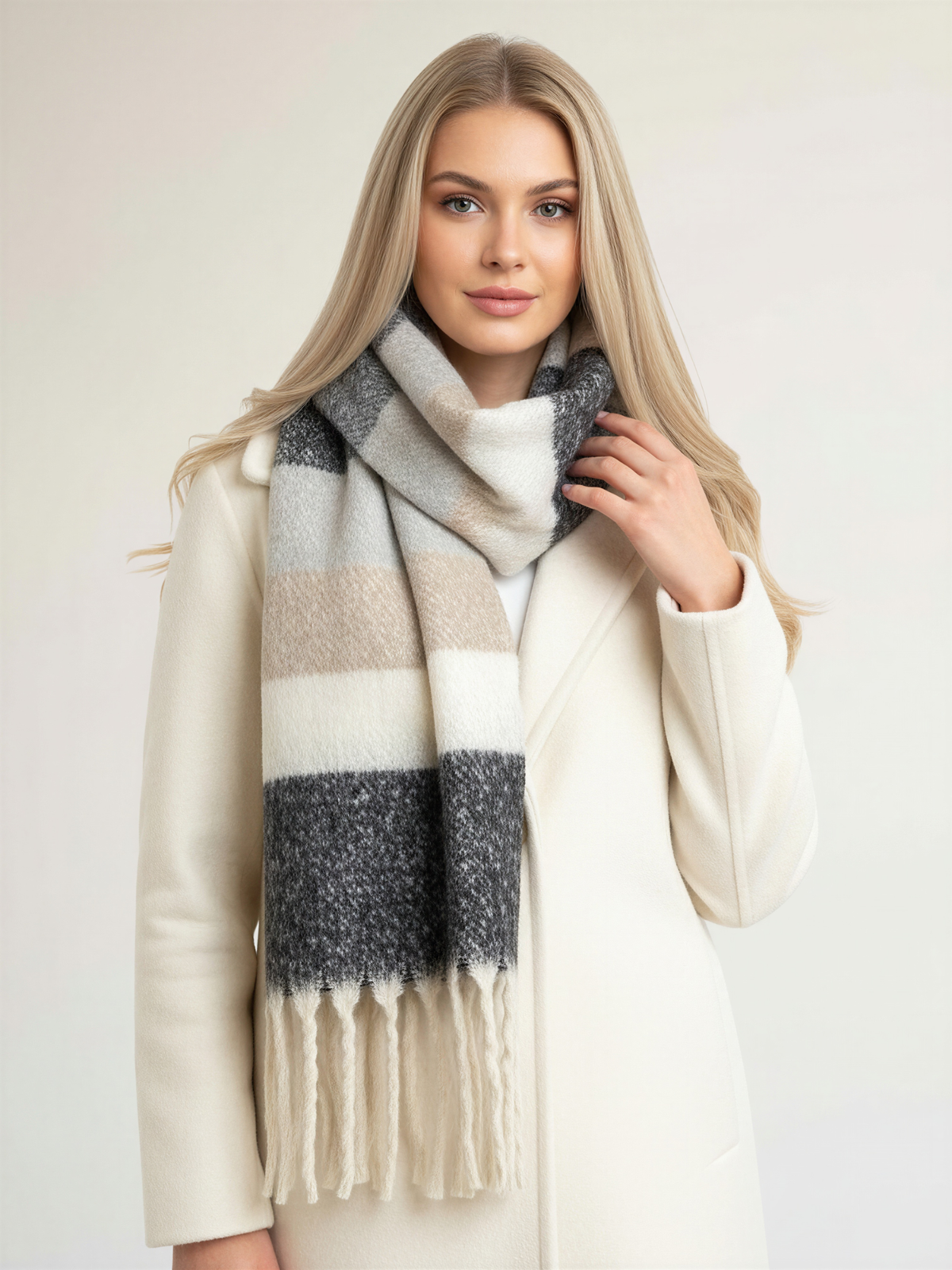 CREAM STRIPED WOOL BLANKET SCARF OVERSIZED WINTER SHAWL WRAP