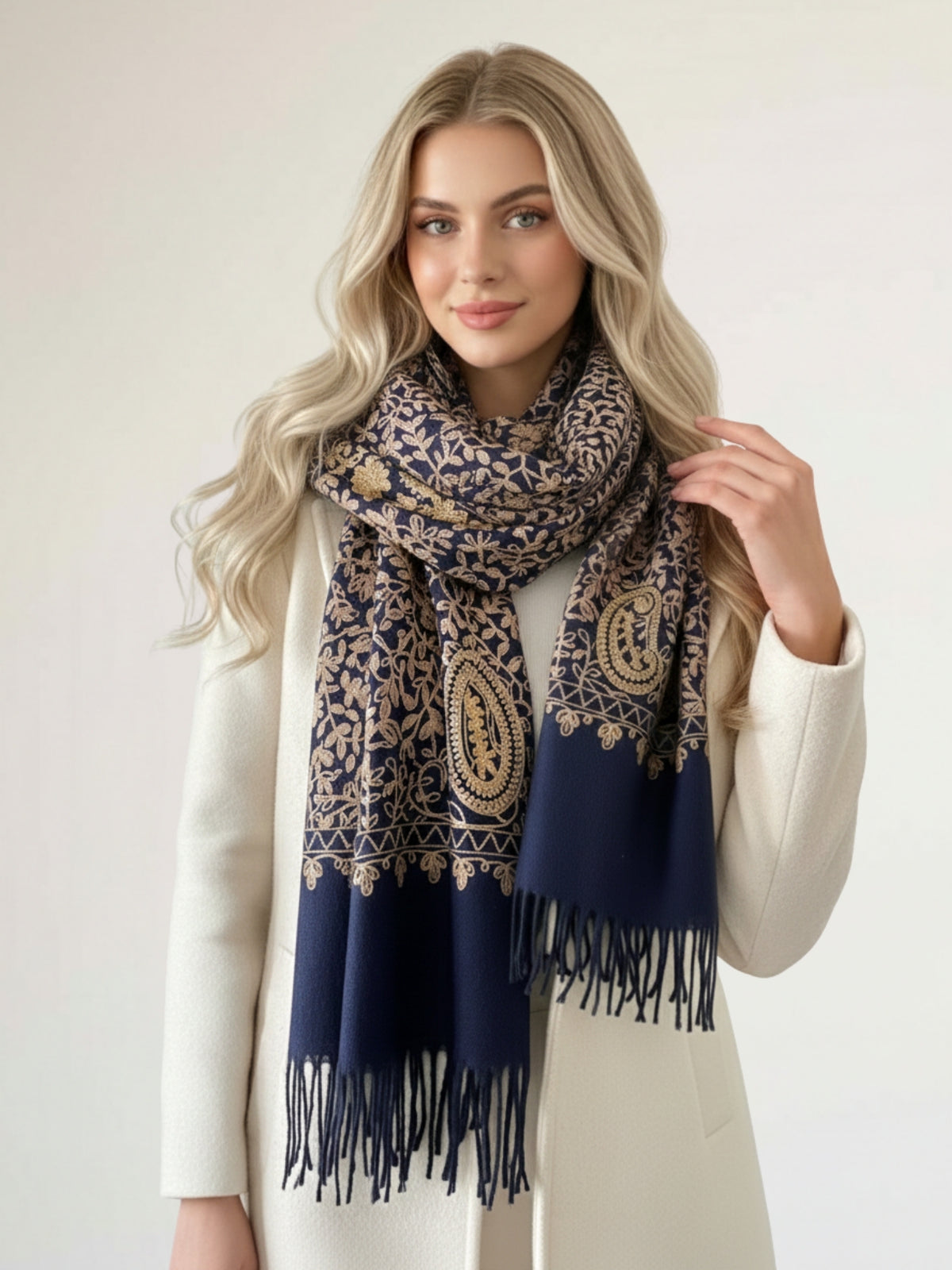 LARGE NAVY PAISLEY CASHMERE COTTON BLEND WINTER SHAWL BLANKET SCARF